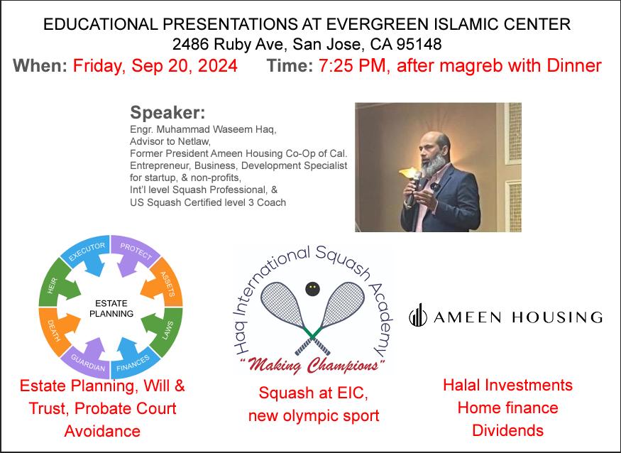 When September 20, 2024 7:30 PM - 8:30 PM Add To Calendar Download ICS Google Calendar iCalendar Office 365 Outlook Live Where Evergreen Islamic Center 2486 Ruby Avenue, San Jose, CA, 95148 Event Type Special Event Map Unavailable EIC – Will, trust and Estate planning By Jawed Iqbal | September 20, 2024 | Special Event | 0 Comments |